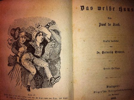 de Kock, Paul. Das weiße Haus. Deutsch bearbeitet v. Heinrich Elsner. 3. Auflage. Stuttgart, Rieger, 1858. Kl.-8°. 414 Seiten. mit Frontispiz in Holzstich, 1 Bl. Verl.anz. Halbleinen der Zeit – Vorsatz mit Etikett der Tübinger Leihbibliothek Lindenmaier. Einband berieben, stockfleckig. Charles Paul de Kock (1793-1871), frz. Schriftsteller niederländischer Abkunft, ein seinerzeit außerordentlich populärer Romanautor mit Stoffen aus dem Pariser Kleinbürgertum.