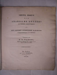 Weijers, H(endrik) .E(ngelinus). Nieuwe Proeve om al de arabische Letters en verdere schrijfteekens door het gewon europeesch karakter onderschenlijk uit te drukken. Leyden, Luchtmans, 1840. Folio. 32 pages. Interims-Broschur. Umschlag mit Einrissen und Fehlstelle, breitrandiges Exemplar. Die Seiten angerändert und im mit kleinen Knickspuren.