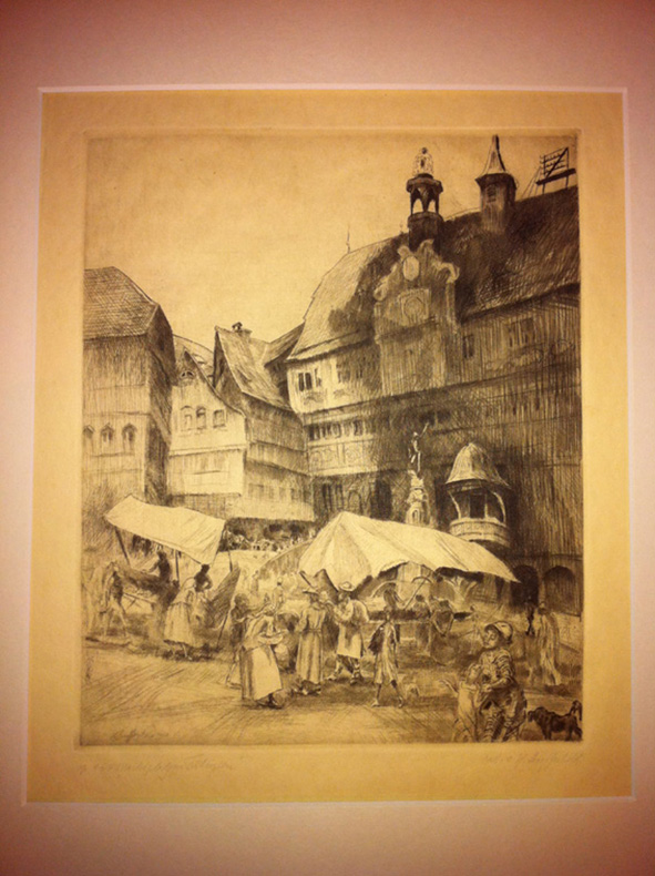 Seufferheld, H. Tübingen – Marktplatz – (Rathaus / townhall). Tübingen, 1922. 30,x 2 x 24,1 cm(Plattenformat) auf Original Radierung auf Japanpapier. Ungerahmt, unter säurefreiem Passepartout. Sehr gut erhalten. Mit Nachlaßsignatur der Witwe: rad. von. H. Seufferheld. Links betitelt: op 164. Marktplatz in Tübingen“.