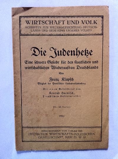 Klupsch, Franz. Die Judenhetze. Eine schwere Gefahr für den staatlichen und wirtschaftlichen Wiederaufbau Deutschlands. Mit einem Geleitbrief von Konrad Haenisch, Preußischen Kulturminister. 111.-160. Tausend. Berlin, Verlag der Deutschen Wirtschafts-politischen Gesellschaft, 1920. Gross-Oktav. 22 Seiten, 2 nn. Seite Anzeigen. pages. Original Broschur. Original brochure. Papierbedingt gebräunt. Umschlag mit zwei kleinen Einrissen, sonst gut erhalten. Trotz der damals hohen Auflage, jetzt seltene Flugschrift.