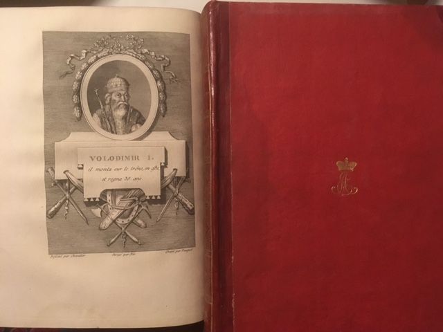 Le Clerc, (Nicholas-Gabriel). (only two volumes of six / special price) Histoire physique, morale, civile et politique de la Russie ancienne (et moderne). 2 vols avec 29 plates !! Vol I.: Histoire physique, morale, civile et politique de la Russie ancienne, tome I. (Plan de l’ouvrage; Culte Religieux des Slaves; plusieurs règnes (Volodimir, Igor II, George II etc.;) Vol VI.Histoire physique, morale, civile et politique de la Russie moderne tome troisieme: conentant la suitede la topographie, de l’histoire naturelle des quarante-deux gouvernements, & et précis historique des peuples de ce vaste empire. L’edition consiste de 3 vols „histoire ancienne“ et de 3 vols „histoire moderne“ et le atlas. Il manque 4 vols et le atlas. Seulement Tom 1 et 6. (2 vols de 6). Paris et Versailles, Froullé et Blaizot, et 1794: Maradan / Blaizot, (1783-94). Quart. 1 Blatt, 510 pp. / Seiten, with 29 plates ( esp. portraits) !; 2 Blatt, VIII, 424 pp./ Seiten. Contemporary half calf binding with gilt spine and gilt noble coat of arms (EA), (Eugène de Beauharnais and Auguste von Bayern). Halbleder des 19. Jahrhunderts mit goldgeprägtem Rückentitel und mit goldgeprägter königlicher Deckelvignette. (Wappen der Beauharnais). – Etwas berieben, die untere rechte Ecke des Vorderdeckels von Band 1 etwas wasserwellig und vereinzelt im unteren Rand leicht wasserwellig. Vorsätze leicht stockfleckig, sonst gut erhalten.The binding of volume 1 is at the lower right corner dampstained. Frontpaper slightly with foxing, otherwise fine. Leclerc (1726-98), was adoctor and went to Russia for more than 20 years. In 1777 he went back to France and is well known as an author of medical works, but most for this entire history of Russia, which was published posthumous. We have only two volumes of the first edition for sale, but the important first volume with 29 plates ( esp. portraits) and the last volume which is rare, since it was published while the revolution.