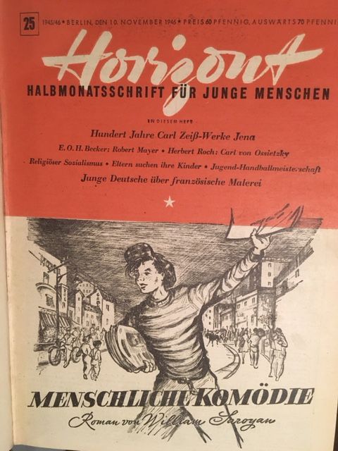 Grosse, Eduard (sen.) und Günther Birkenfeld. Horizont. Monatsschrift für junge Menschen. 3 komplette Jahrgänge. 8 Bände. Berlin, Verlag Horizont, 1945-1948. Folio Mit den Originalumschlägen eingebunden in uniforme Halbleinenbände mit Rückenschild. Gut erhalten, in Band 1 jedoch die ersten Seiten knapp beschnitten, mit Buchstabenverlust. Wichtige und interessante Jugendzeitschrift, die von 1945 1948 erschienen ist, hier komplett vorhanden.