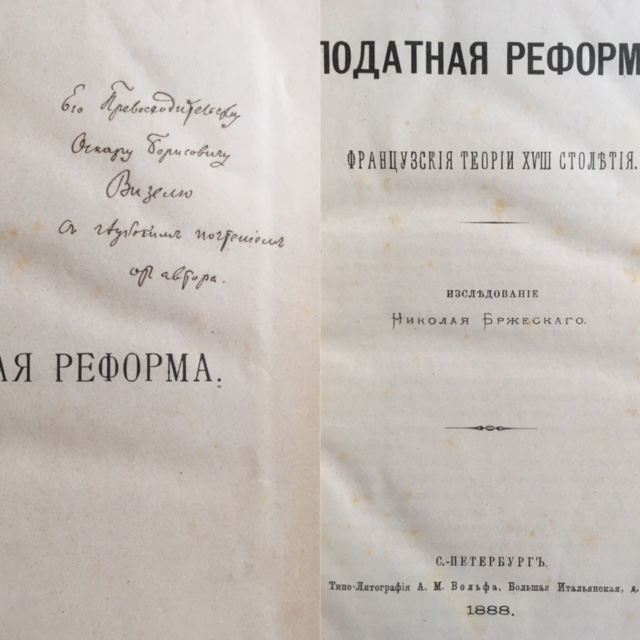 Brzhesky / Brzesky Nikolai. Podatnaja reforma francuzskija teorii XVIII stoletija. (The tax reform. French theories of the 18th century. St. Petersburg, Wolff, 1888. Gross Oktav. XVII, 194 pp. Original half leather bound with gilt spine. The binding slightly damaged at the, the paper a bit browned, otherwise fine. Important publication by the Russian professor for tax law, politician and economist Brzesky (1860-1910) with his dedication to Oskar Boris Witzel.
