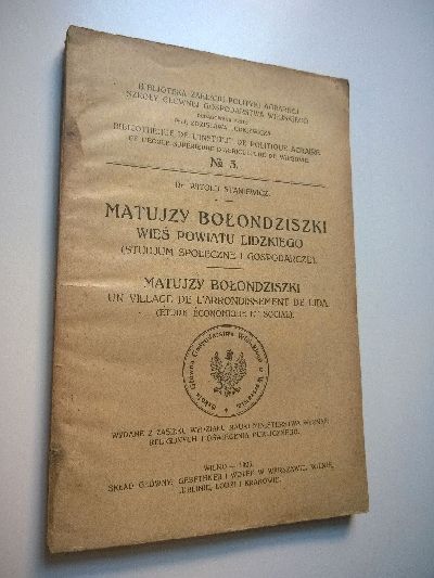 Staniewicz, Witold. Matujzy Bolondziski.Sies powiatu lidzkiego. un village de l’arrondissement de Lida/Lyda. Étude édonomique et social. Wilno, Gebethner, 1923. Oktav. 158 pp, 1 nn. p. With two folded maps (Wezsoka) and a folded plate. Original brochure. The brochure is a bit browned. = Biblioteka zakladu polotyki agrarnej szkoly glownej gospodarstwa wiejskiego.