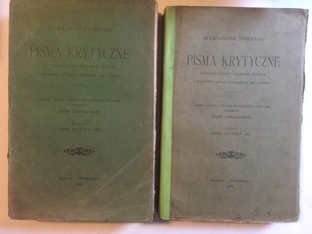 Tyszynski, Aleksander. Pisma krytyczne. Pisma do roku 1866. Pisma od roku 1866. 2 volumes. Krakow / Petersburg, Lewental, 1904. Gr. Octav. 478 , 2nn pp; 834, 2nn pp. Original brochures. Volume I with rebacked binding, A. Tyszynski, geb. 1811 in Petersburg (1880). Ästhetiker u. Kritiker.