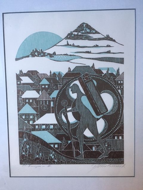 Degenhardt, Manfred Ansicht von Eningen mit der Achalm im Hintergrund. um 1970 Format ca 40 x 25 cm Original Farbholzschnitt. Links unten betitelt „e.a. Eningen u. A“ und rechts unten „Degenhardt“. Unter Passepartout. Gut erhalten. Degenhardt (*1940) in Sigmaringen geboren, Maler, Bildhauer (Keramik) und Holzschneider. Auch Autor von Werken zum Thema Holzschnitt bzw. mit Illustrationen.