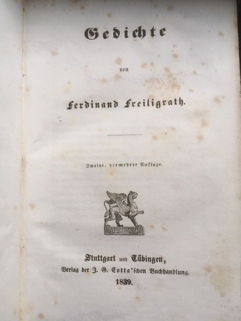 Freiligrath, Ferdinand. Gedichte. (darunter auch Übersetzungen aus dem Französischen und Englischen). 2. vermehrte Auflage. Stuttgart und Tübingen, J.G. Cotta, 1839. Oktav. X, 504 Seiten. 1 Blatt Verlagsanzeigen mit den Titeln von Hölderlin, Goethe, Schiller etc. Original blind geprägter Leinenband. Durchgehend stockfleckig, der Einband etwas fleckig, mit Namenszug „Rudolf Georgii, Esslingen“, auf dem Titelblatt. Freiligrath (*1810 in Detmold, 1876 in Bad Cannstatt), Freimaurer, Revolutionär, Dichter, machte Bekanntschaft mit Franz Liszt, Karl Marx, Gottfried Keller etc.