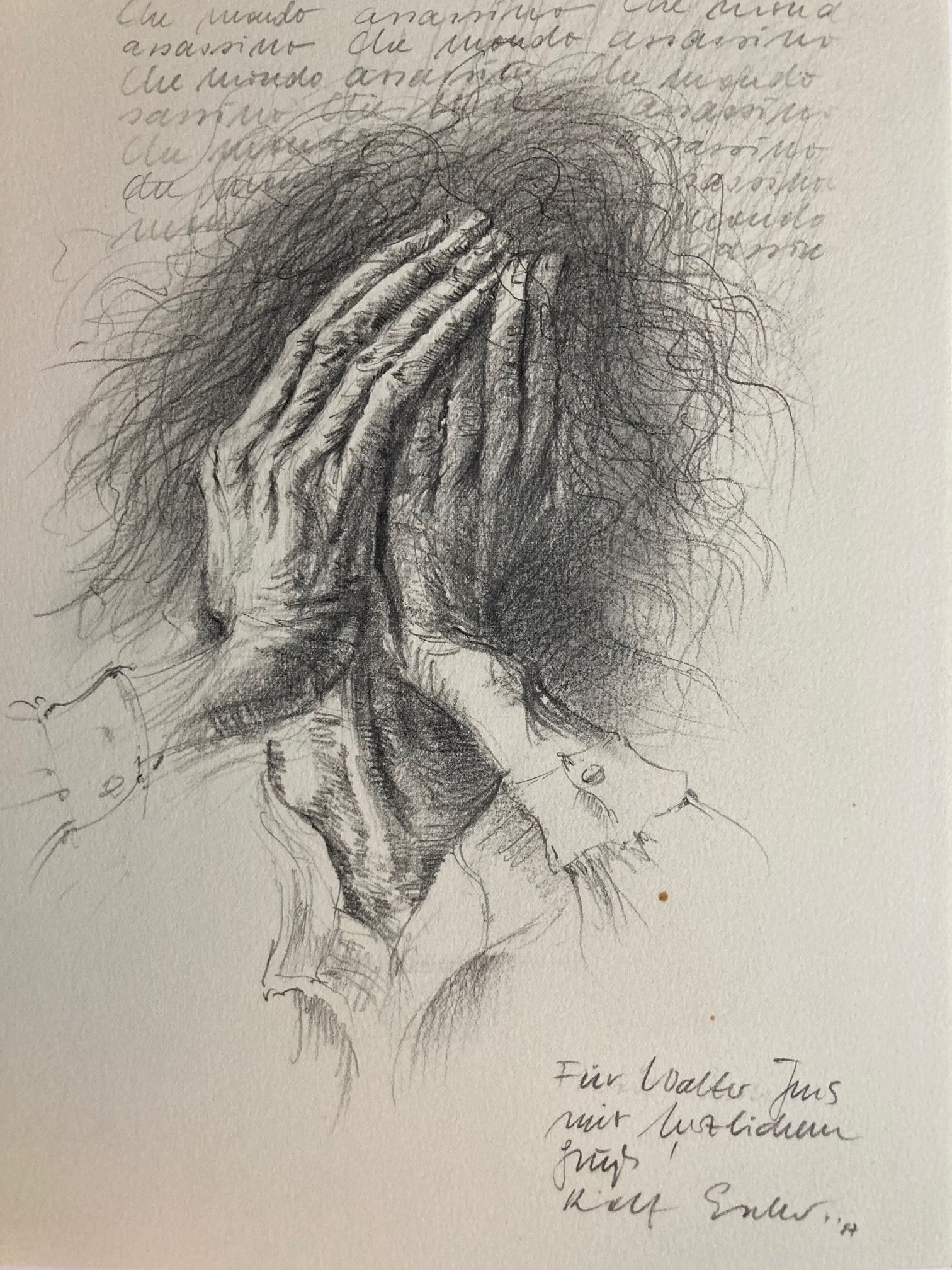 Escher, Rolf. „Che mondo assassino“ aus der Serie „Das verlorene Gesicht“. Original Graphit / Bleistift Zeichnung. 1987. 29,5 x 21,2 cm. Darstellung. Technik: Bleistift / Graphit auf Büttenpapier. Zustand: Gut erhalten, bis auf zwei kleine Rostflecken oberhalb der Widmung. Der obere Teil der Widmung wurde ausradiert und von Rolf Escher persönlich überschrieben. © VG Bild-Kunst, Bonn, 2021