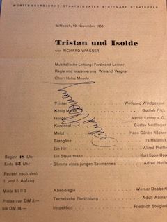 Varnay, Astrid. Programmzettel. *signiert* Tristan und Isolde von Richard Wagner, musik. Leitung Ferdinand Leitner. Stuttgart, Württembergisches Staatstheater. 1958 21,5 x 14,5 cm. 2 Blatt. 2 fach gefaltet. Knickspuren, Mit ausgeschriebener Signatur in Kugelschreiber „Astrid Varnay“.