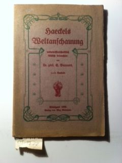 Dennert, Eberhard. Haeckels Weltanschauung. Naturwissenschaftlich-kritisch beleuchtet. Stuttgart: Max Kielmann, 1906. 8°. 111 Seiten, 3 n. n. Seiten. Original Broschur. Gebrauchsspuren, leicht angestaubt, sonst altersgemäß guter Zustand. Erste Auflage. Eberhard Dennert (1861 – 1942) war Schuldirektor und Begründer und bis 1920 wissenschaftlicher Leiter des Keplerbundes.