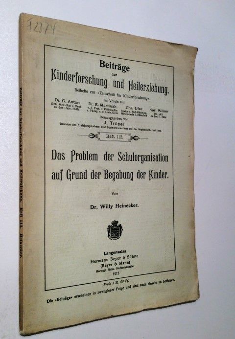 Heinecker, Willy. Beiträge zur Kinderforschung und Heilerziehung. Heft 113. Das Problem der Schulorganisation auf Grund der Begabung der Kinder. Langensalza, Hermann Beyer & Söhne, 1913. Gr.-8° / Oktav. X, 83 Seiten. Original Broschur. Einband lichtrandig sowie leicht lädiert, Papier gebräunt.