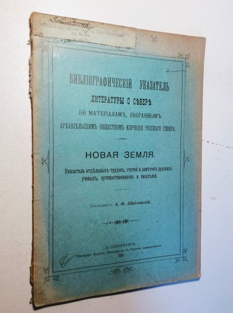 Shidlovskij A.F. (editor). Novaya Zemlya. Chast’ I. Ukazatel’ otdel’nykh trudov, statej i zametok russkikh uchyonykh, puteshestvennikov i pisatelej. S.-Peterburg, Tipografiya morskogo ministerstva,v glavnom Admiraltejstve. 1910. Quart. 63 pages, 7 nn. pages. Original green brochure. The brochures is a bit worn.