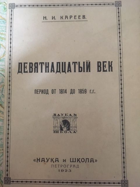 Kareev, Nikolai, Ivanvic. Devyatnadtsatyj vek. Das 19. Jahrhundert. The 19th century. Period ot 1814 do 1859 g.g. Period from 1814 to 1859. Petrograd, Nauka i shkola, 1923. G. 8°. 120 pp. Original brochure. Margins uncut, rear cover page is missing. Kareev (1850-1931) was Russian historian and sociologist.About the history in the 18th and 19th centuries, namely about international politics in Europe (periods of peace and war, the Restauration time, the July Monarchy, colonialism, etc.) and the historiography of particular countries (Austria, England, Germany, Italy, Poland and France). No reprint.