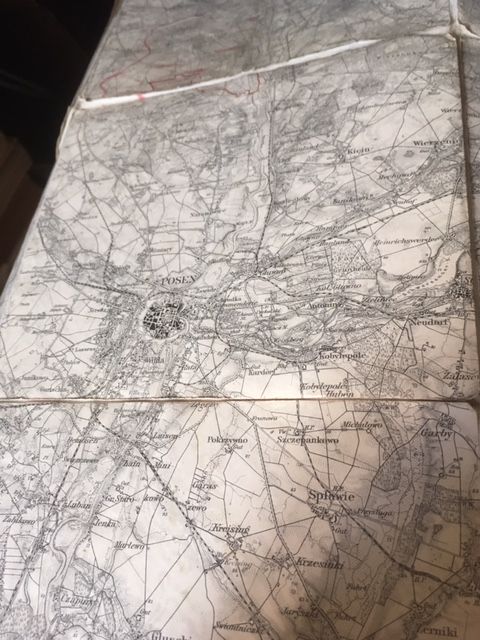 Karte der Umgebung von Posen/Poznan. um 1920. Mehrfach gefaltet. Karte auf dem weißen Leinengrund, aufgezogen. Außen fleckig. Teils koloriert. Posen/Poznan ist die Hauptstadt der polnischen Woiwodschaft Großpolen und die fünftgrößte polnische Stadt.