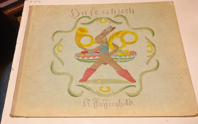 von Freyhold, Edmund. Osterbuch. (Hasenbuch). Verse von Ch(ristian) Morgenstern. Berlin, Verlag von Bruno Cassirer. 1908. Quer- 4to. 17 Blatt. Mit koloriertem Titel und 16 handkolorierten lithographierten Tafeln von K.F.E. von Freyhold, Original Halbleinen mit koloriertem Vorderdekcel. Der Einband leicht gebräunt, die Ecken leicht bestossen. minimale Flecken auf dem vorderen Vorsatzblatt, das Gelenk leicht gelockert. Seltene erste Ausgabe auf starkem Velinpapier. Mit schönen Kinderversen von Christian Morgensterns, die er zu den Bildern von Freyhold geschrieben hat. Das Kinderbuch sollte nicht erzieherisch wirken. Die Herstellung verzögerte sich, es wurde nicht zu Ostern fertig, daher der abweichende Titel „Hasenbuch“, statt „Osterbuch“. – Stuck-Villa II, 186.