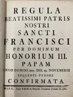von Assisi, Franz von. / Franciszek z Asyzu (swiety) Regula Beatissimi Patris Nostri Sancti Francisci Per Dominum Honorium III. Papam Anno Domini 1223. Die 29. Novembris Sequenti Tenore Confirmata. Wilnae / Vilnae, Typis S.R.M. & Reipubl. Scholarum Piarum, 1760. Oktav. Titelblatt, 10 nn. Blatt. Spätere Interimsbroschur. Later brochure. Good, no stamps. Rare Vilnius / Vilnae / Wilno printed text by Franciszek z Asyzu. (1181?-1226).