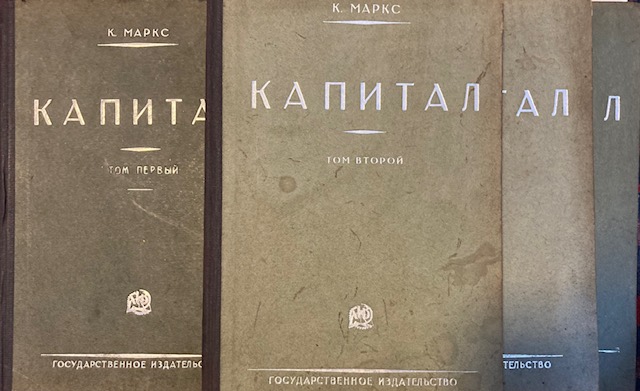 Marx, Karl; Engels, Friedrich. Kapital. Kritika politishekoj ekonomij Izdanie pjatoe. 3 parts in 4 volumes. Moskva, Gozudarstvennoe Izdatelstvo, 1930 Small folio. XLVI, 27; XXI, 3: XXIV,359 pages; 4: IV, 344 pages. Half cloth binding with embedded silver printed titles. A bit worn and stained. Rare Russian translation based on 1906 edition of the Collection of Historical Works, translated by Bazarov and Stepanov.