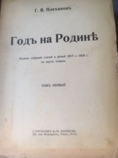 Plekhanov, G. V. God na Rodine. ( The year at home). Polnoe sobranie statej i rechej 1917-1918 g. v dvukh tomakh. 2 volumes. ( complete). Paris, J. Povolozky & Cie, editeurs, 1921. Gr. 8°. volume I : XLVIII, 247 pages, 2 photographs; Volume II: 270 pages, 2 photographs. Original cardboard binding. Partly worn and a bit stained. A complete collection of speeches and articles of G.V. Plekhanov.