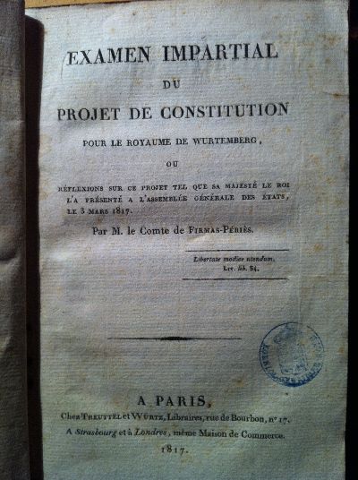 Firmas-Périès, (Armand Ch. D.). Examen impartial du Projet de Constitution pour le Royaume de Wurtemberg, ou réflexions sur ce projet tel que sa Majesté le Roi l’a présenté à l’Assemblée Générale des Etats, le 3 mars 1817. Paris, Treuttel & Würtz, 1817. Oktav. 2 Bll., 209 Seiten., 1 Bl. Buntpapierumschl. der Zeit – Angestaubt, StaT., leicht stockfleckig. Firmas-Périès (1770-1828), französischer Schriftsteller und General, verließ Frankreich nach einer kurzzeitigen Inhaftierung 1791. 1793 wurde er zum Oberst des Regiments von Hohenlohe-Schillingsfürst und kämpfte 1793 gegen die Republikaner. Bis 1813 stand er im Dienste des Königs von Württemberg. – NBG XVII, 743; Heyd III, 1553e (dort Tübingen und Stuttgart 1817); nicht bei Adam.