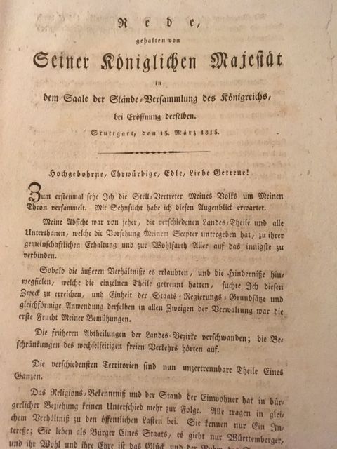 Friedrich I., König von Württemberg. Rede, gehalten in dem Saale der Stände-Versammlung des Königreichs, bei Eröffnung derselben. Stuttgart, den 15. März 1815. Folio. 2 Bll. – Unbeschnitten. Sehr frisch und nahezu fleckenfrei. Rede anläßlich der feierlichen Verlesung der für alle Landesteile gültigen württembergischen Verfassungsurkunde.